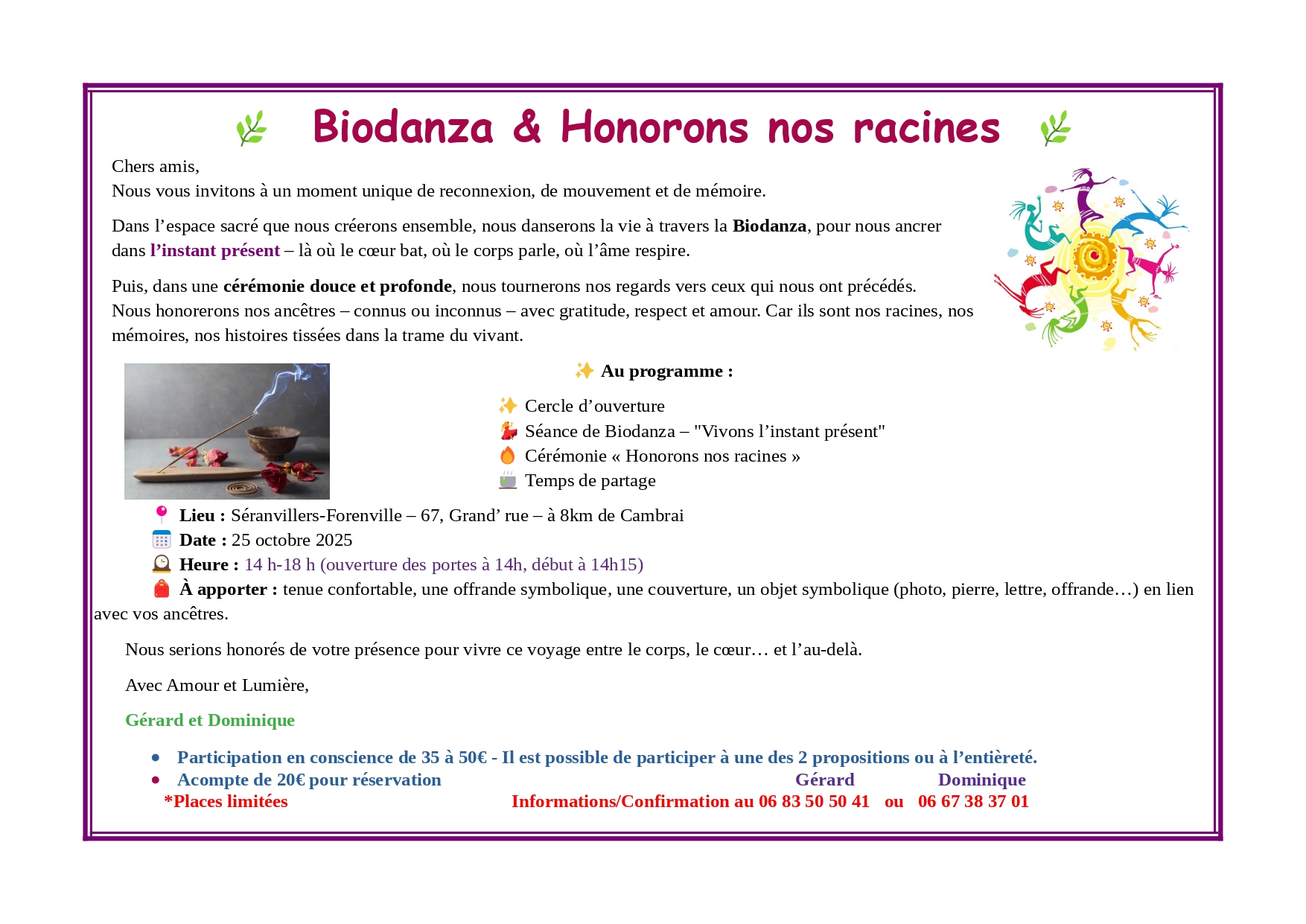 Dans l’espace sacré que nous créerons ensemble, nous danserons la vie à travers la Biodanza, pour nous ancrer dans l’instant présent , là où le cœur bat, où le corps parle, où l’âme respire.
